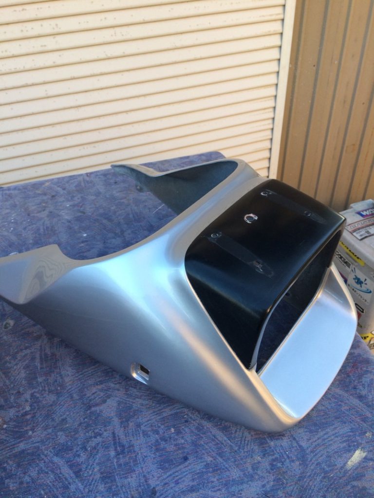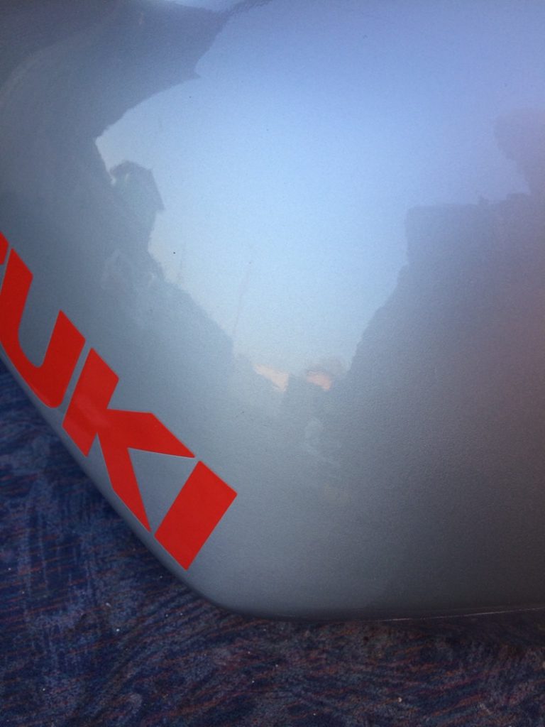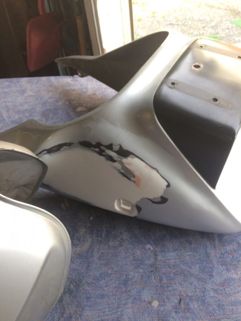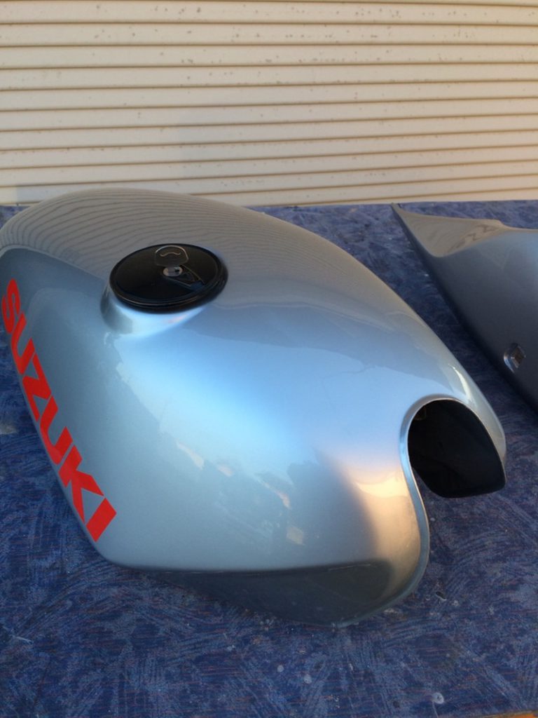 刀の外装補修です、タンクの凹み、アッパーカウルの割れ。アッパーはどこかで直してありました、が、パテの巣穴が多い 。タンクは引っ張ってからパテ。シルバー塗ってクリア、デカール貼ってクリア純正っぽく仕上げました。